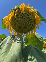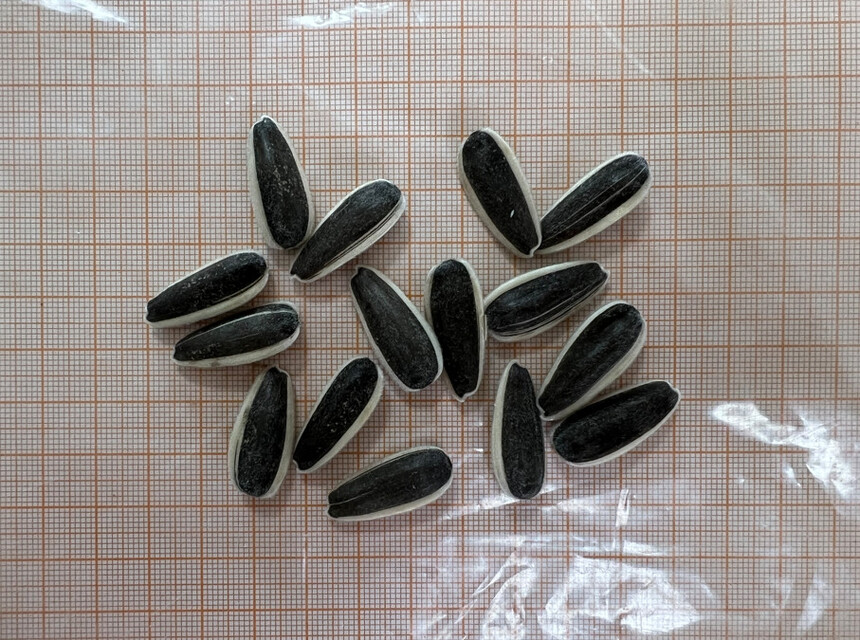 特征特性:食用型向日葵,属中早熟品种,生育期100天左右,株高190厘米左右,茎杆直径4.0厘米左右,叶片数30~31片,花盘平、水平向下,花盘直径25厘米左右,单盘粒重145.1~147.1克,出仁率54.7~56%,结实率75.2~76.1%。籽粒长锥形,粒长平均2.55厘米,粒宽平均1.1厘米,百粒重24.5~25.1克,籽粒主色为黑色,边缘为白色,边缘间有不规则弱白色条纹。